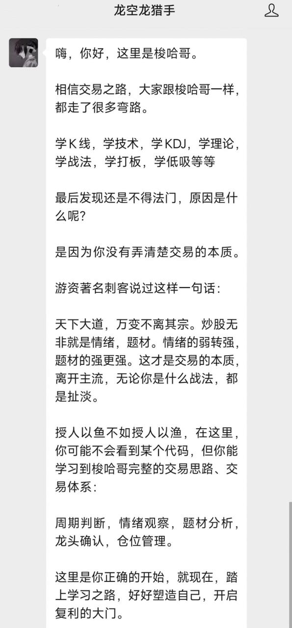 授人以鱼不如授人以渔,在这里,你可能不会看到某个代码,但你能学习到梭哈哥完整的交易思路、交易体系: